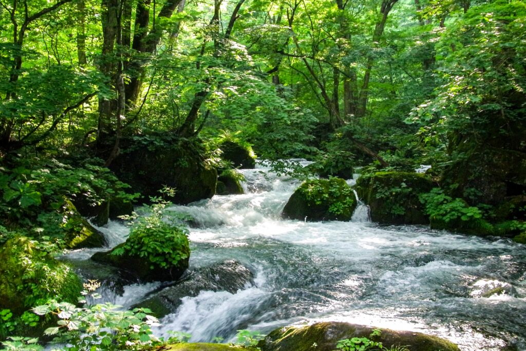 青森県十和田市に位置する「奥入瀬渓流(おいらせけいりゅう)」は、十和田湖から流れ出る清流に沿って広がる約14kmの渓谷です。四季折々の風景が美しく、特に新緑の春と紅葉の秋は多くの観光客で賑わいます。